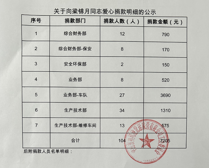 梁锦月是中山市神湾港货运联营有限公司车队拖车司机。在2023年2月初,梁锦月的儿子因身体不适去中山市人民医院进行身体检查,检查结果是淋巴瘤复发,确诊为急性白血病。在5年前他儿子已经历过一场化疗治疗,家庭经济非常拮据。因他儿子对化疗治疗反应非常激烈,情况不乐观,目前在重症室(ICU)处于昏迷状态,病情十分严重。一方有难,八方支援。当公司工会得知他的情况后,3月6日,神湾港工会第一时间号召全体职工为梁锦月儿子进行爱心募捐活动。在神湾港工会的倡议下,各部门车间班组积极响应,广大干部职工慷慨解囊,一颗颗爱心,一份份真情,大家用实际行动,表达了对同事的关心与帮助。涓涓细流可以汇流成浩瀚大海,点滴善举可以汇聚成爱的洪流,共募得104位同事7205元的爱心捐款。