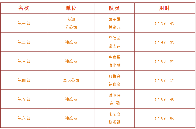 本次竞赛设置了两个考核项目:一是抛、盘水带;二是完成水带与消防栓、水枪的有效连接,同时放水射中目标障碍物。重点考核水带抛出的距离要达到要求、未出铺带线、未出现扭圈现象,消防栓和水枪接口牢固、不出现脱口、卡口和漏水现象等。根据两个项目叠加总时间的长短决出名次。前6名获奖消防队如下: