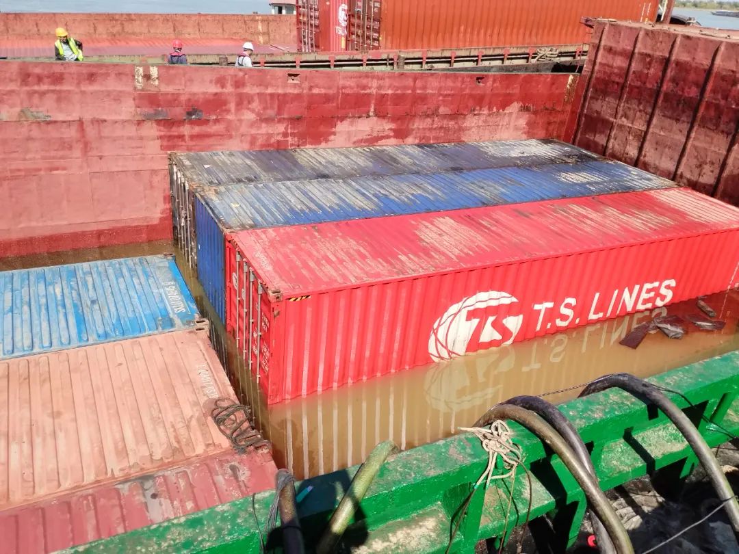 针对部分集装箱货物在水中浸泡时间较长,为防止出现集装箱货物超重影响作业安全的情况,中山港高度重视,组织生产技术操作团队人员进行讨论分析,强调现场作业人员要严格执行特殊作业流程,在海关执法人员监管下,通过打开箱门检查箱子积水情况,检查确认吊机负荷情况再执行起吊作业。