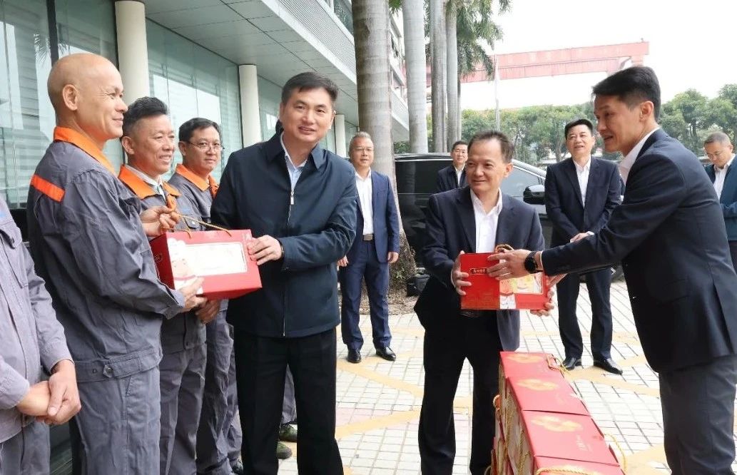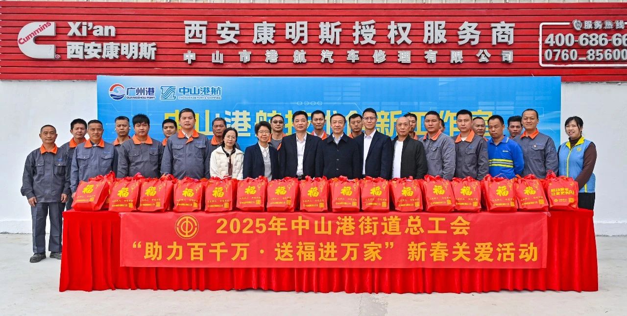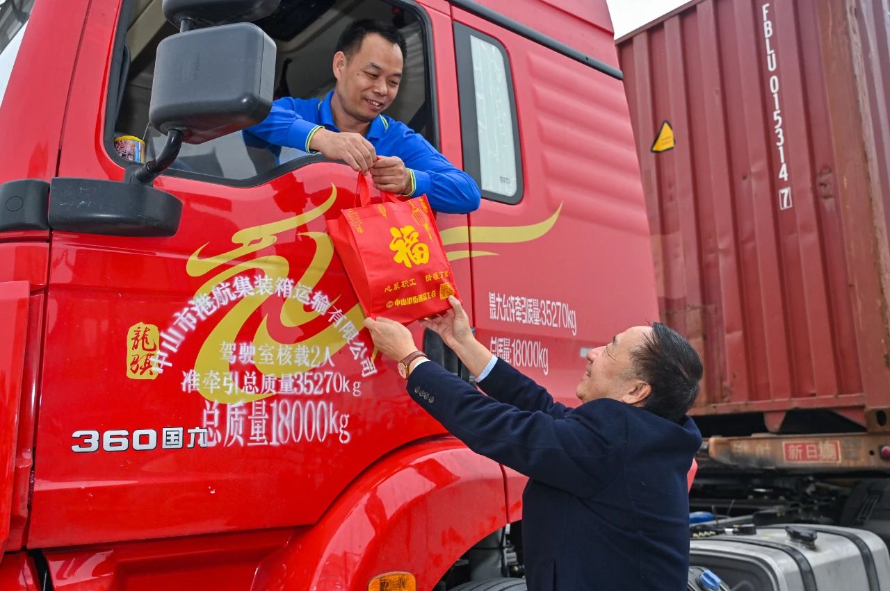 中山港街道总工会走进中山港航开展“助力百千万·送福进万家”新春关爱活动。考振柱向中山港航一线职工派发“福袋”,送上工会娘家人的新春祝福,祝愿大家“巳巳如意”。