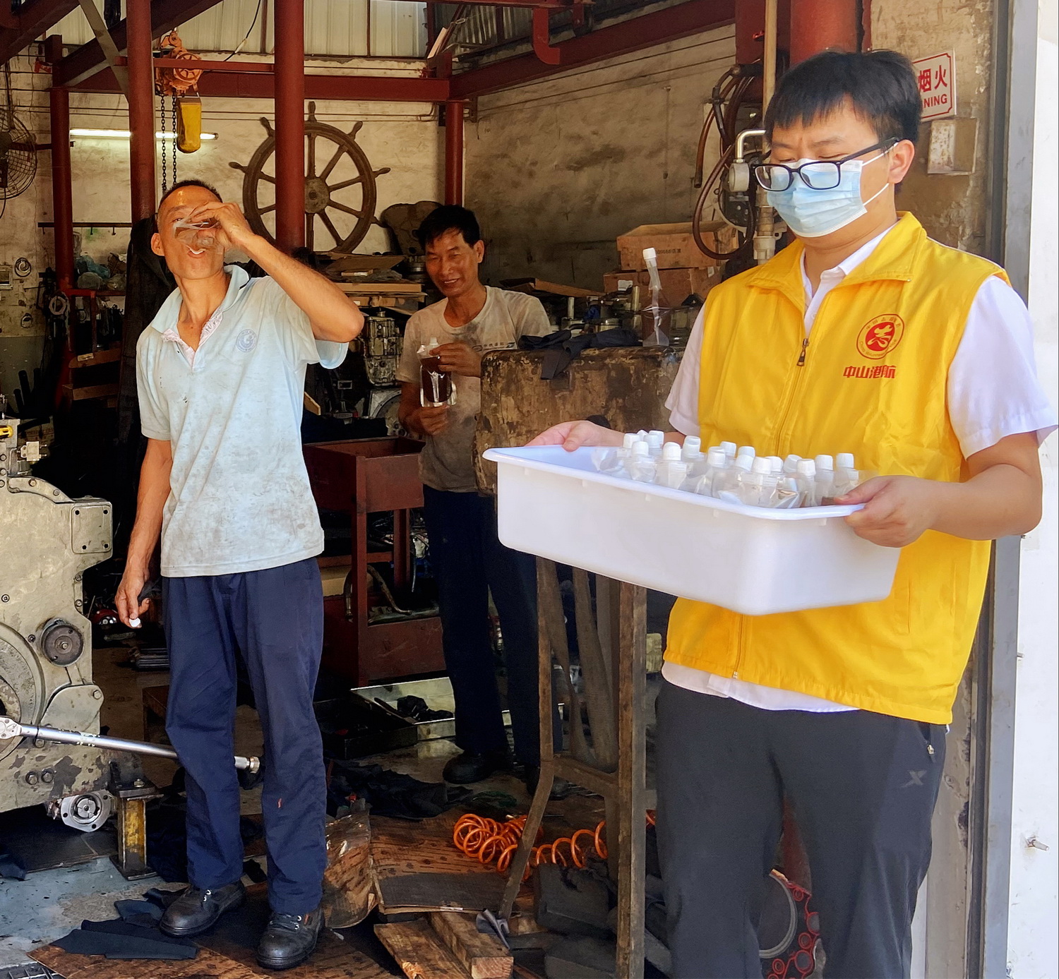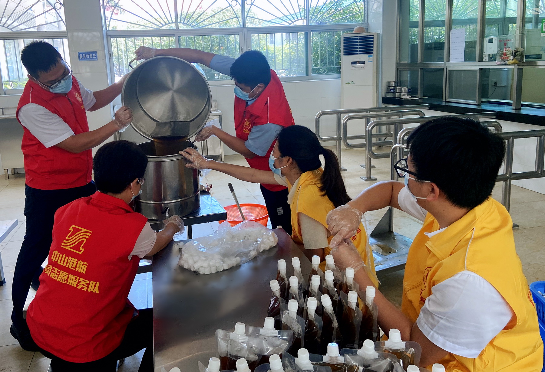 既要做好疫情防控,又要保障生产。面对当下高温天气,生产一线员工,尤其是港区维修车间、机械操作司机等岗位人员,面临精神上和身体上两重压力。中山港航青年感同身受,尽己所能,做好后勤保障工作。组织力量利用公司饭堂煲制降暑凉茶,经过独立罐装,专门派送到港口一线员工手上,既方便引饮用,又能预防中暑,彰显人文关怀。