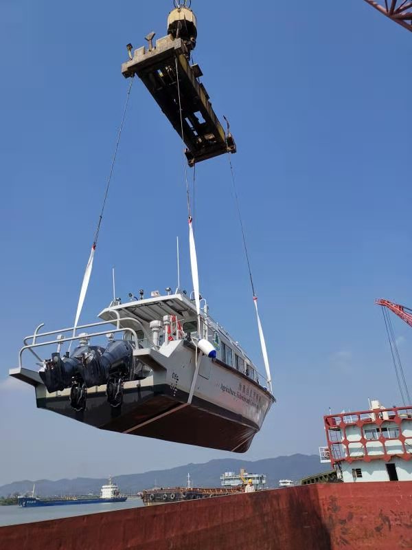 多艘整船一起装船出口,非常考验神湾港的装卸工艺。经过多个部门的相互协作,并与客户展开充分沟通,经现场研究制定安全稳妥的装船方案,顺利地将执法艇起吊装上承运船舱的固定铁架上面,加上捆绑加固和反复检查,大约30分钟就完成了一艘艇的装船工作。神湾港操作安全和高效的服务质量,获得了客户高度的认可。