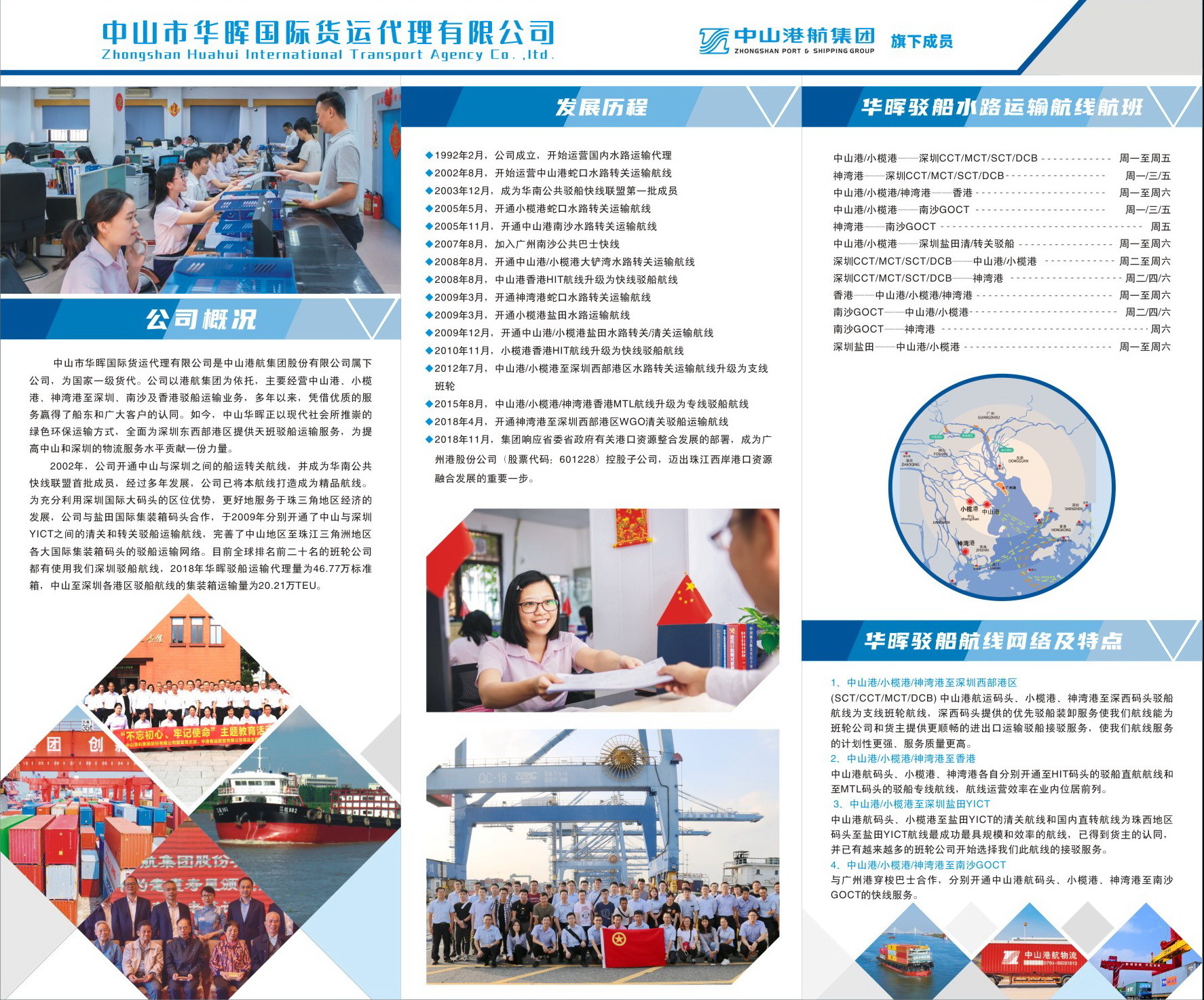 中山港航集团近70年传承发展,港航合一,经营有港口装卸、船舶运输、货运代理、陆运集运、智能仓储和香港业务六大业务板块,以客户需求为导向,为客户提供一条龙、一站式的港航物流及配套服务,诚邀与广大客户共创美好未来!