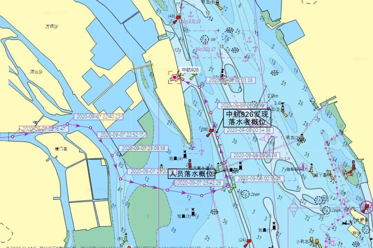 经询问,落水者与另一名同伴,于9月7日22:30左右所驾小艇在深中通道大桥附近沉没落水,同伴失踪;正值涨潮,落水者随着潮水往广州南沙方向漂移直至被发现救起,在海水里漂移了约2.2海里,浸泡了超过2个小时。“中航926”船把了解到的情况及时向公司和广州交管中心进行报告,同时在附近水域慢速顺潮水方向展开搜索,未发现另外一名落水者。