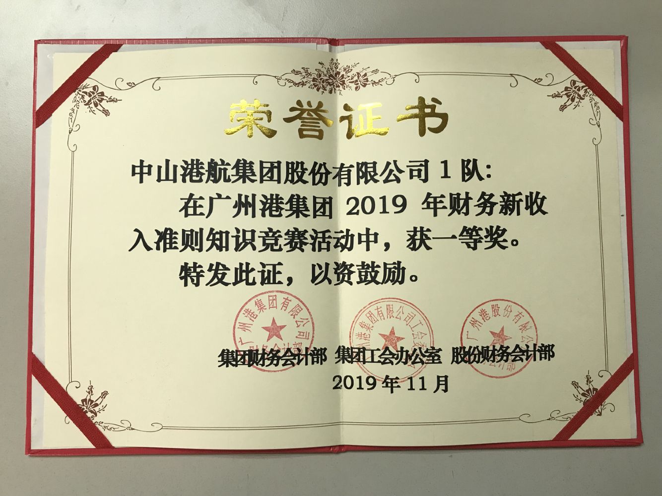 11月份,广州港集团/股份财务会计部、工会举办了2019年财务新收入准则知识竞赛。中山港航集团6名同事组成两支队伍参赛,其中由来自中山港计财部余健龙、集团公司财务部郑敏妍、小榄港计财部梁天生组成的中山港航1队,以296分的高分从44支参赛队伍中脱颖而出摘得桂冠,荣获一等奖。