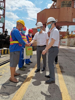 6月18日上午,集团党委书记、董事长郭勇,工会主席、副总经理阮杰航带领党群工作部、人力资源部等职能部门人员,前往中山港码头作业现场慰问一线操作员工和船员。